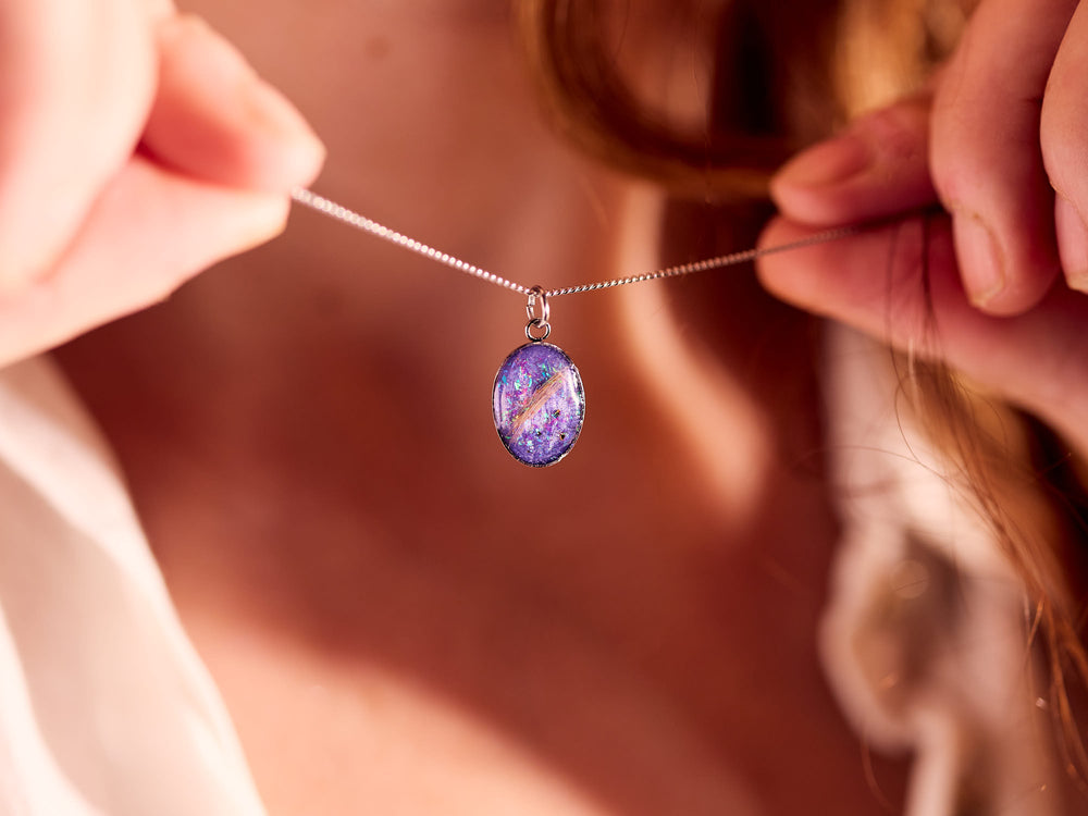 In deze collectie vind je zowel kettingen die je zelf kunt vullen met as of een klein aandenken, als sieraden waarbij wij de as, en eventueel andere persoonlijke inclusies zoals een haarlok of vacht, zorgvuldig verwerken in de steen van het sieraad.